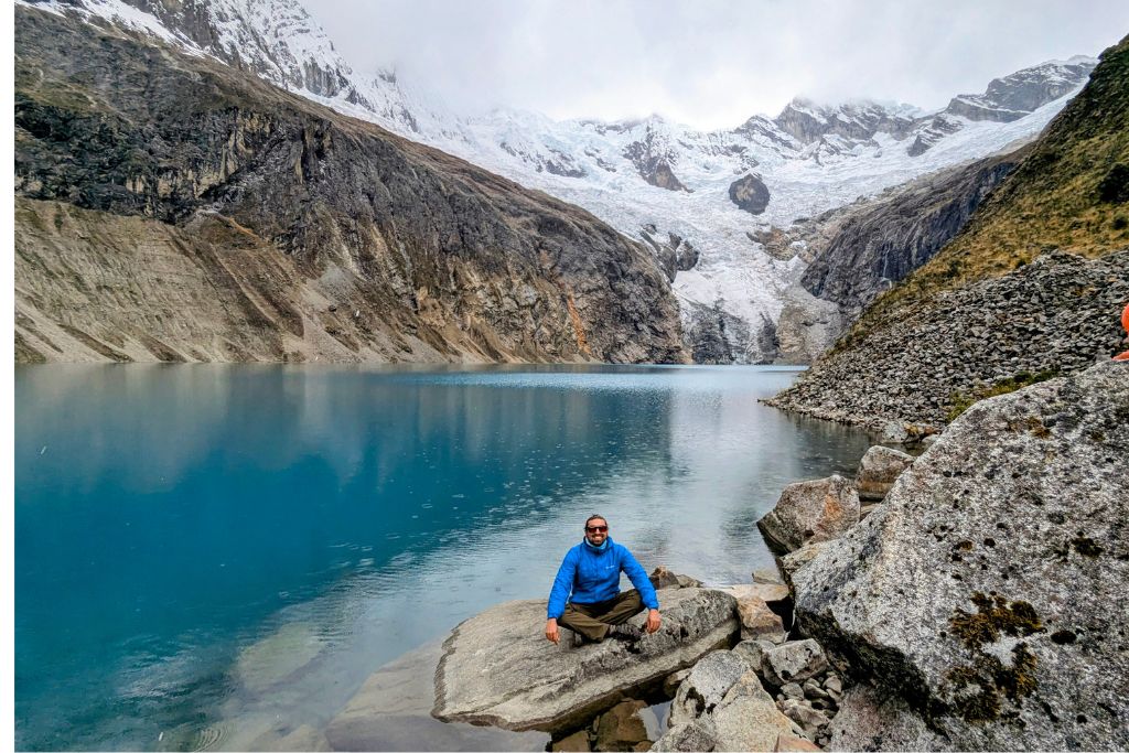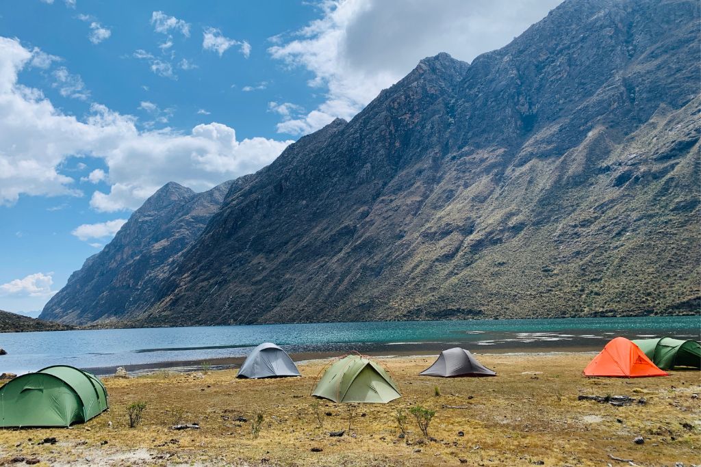 Eventually, we reached the fork leading to Laguna Arhuaycocha, one of the most beautiful lakes in Peru. The detour was steep but worth every step. The lake shimmered below Artesonraju, the mountain that inspired the Paramount Pictures logo. Its turquoise water glowed under the afternoon sun, framed by glaciers and silence. We lingered there, taking photos and trying to absorb every detail before heading to camp.